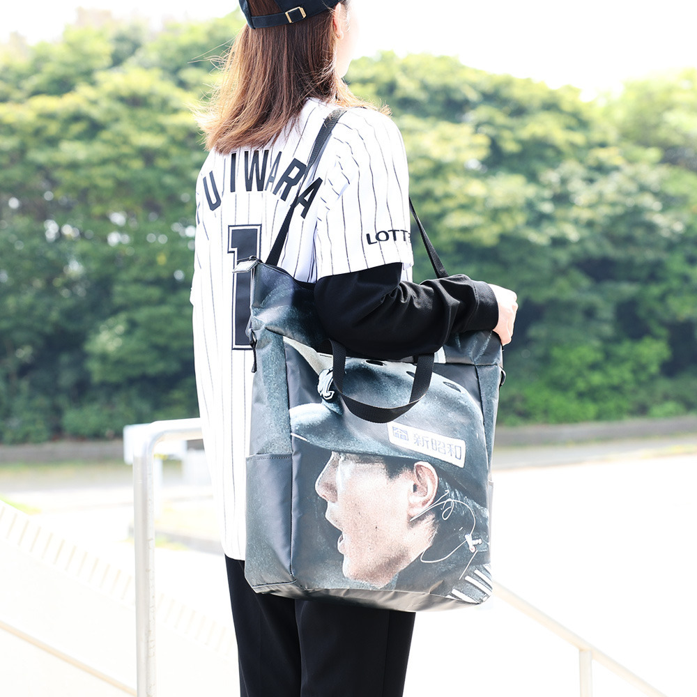 2024年に球場で使用したターポリン幕をリメイクして作られた、1点ものの特別なトートバッグです。トートバッグ正面に選手の写真を大胆に配置し、選手の存在をリアルに感じられるデザインに仕上げました。さらに、右下には選手の直筆サイン入り。唯一無二の貴重な商品をあなたへお届けします!