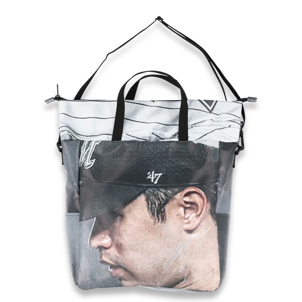 2024年に球場で使用したターポリン幕をリメイクして作られた、1点ものの特別なトートバッグです。トートバッグ正面に選手の写真を大胆に配置し、選手の存在をリアルに感じられるデザインに仕上げました。さらに、右下には選手の直筆サイン入り。唯一無二の貴重な商品をあなたへお届けします!