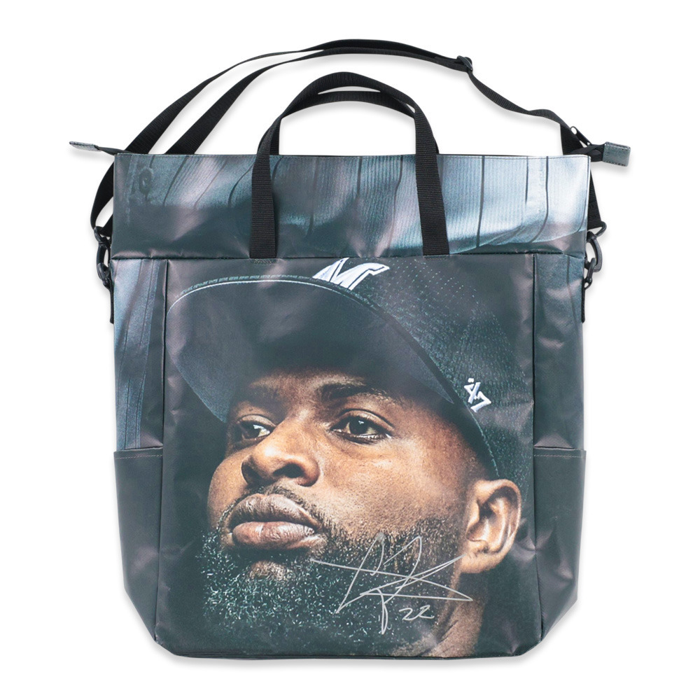球場正面入り口に2025年掲載したターポリン幕をリメイクして作られた、1点ものの特別なトートバッグです。トートバッグ正面に選手の写真を大胆に配置し、選手の存在をリアルに感じられるデザインに仕上げました。さらに、選手の直筆サイン入り。唯一無二の貴重な商品をあなたへお届けします!
