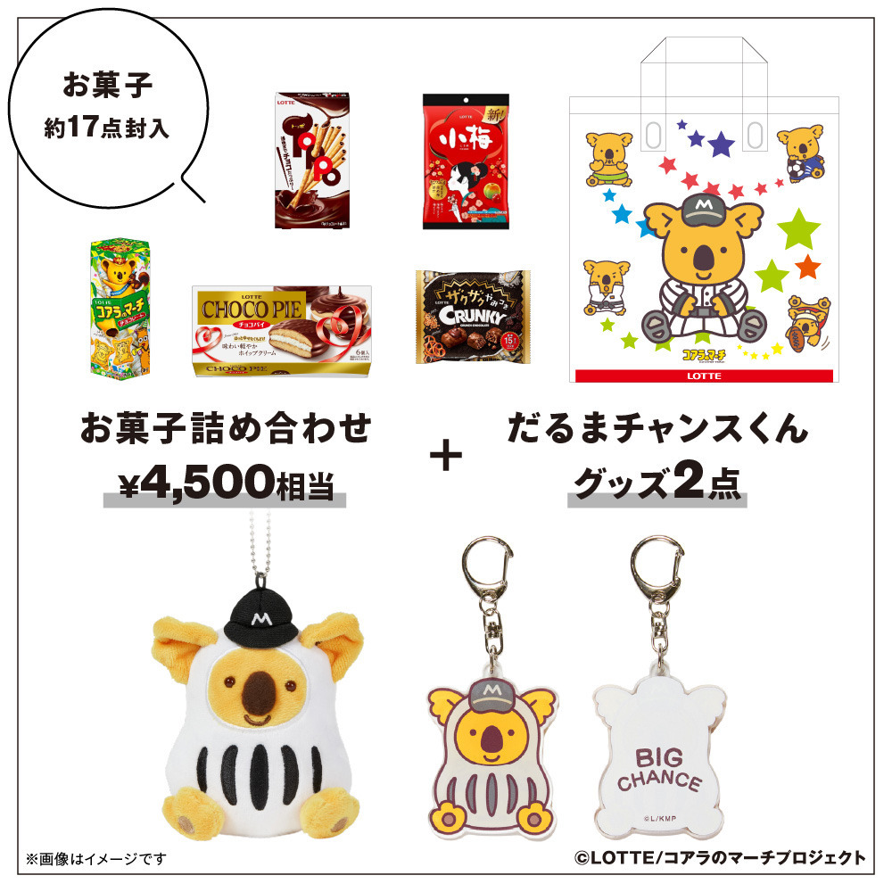 コアラのマーチなど4,500円(税込)相当のロッテのお菓子に加え、新春をイメージして作られた「だるまチャンスくん ぬいぐるみキーチェーン」と「だるまチャンスくん アクリルキーホルダー」を入れてお届けする福袋です!