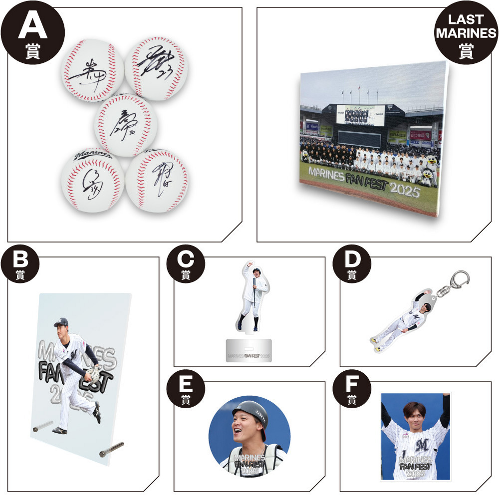 1回550円(税込)のオンラインくじです。12月のオンラインくじは、MARINES FAN FEST 2025 イベント(白黒野球対決)中の22選手の選手画像を使用したデザインになっています。最後の一回を回していただいた方には、LAST MARINES賞として、選手集合写真をデザインに使用した今回限定のキャンバスボードが手に入ります!