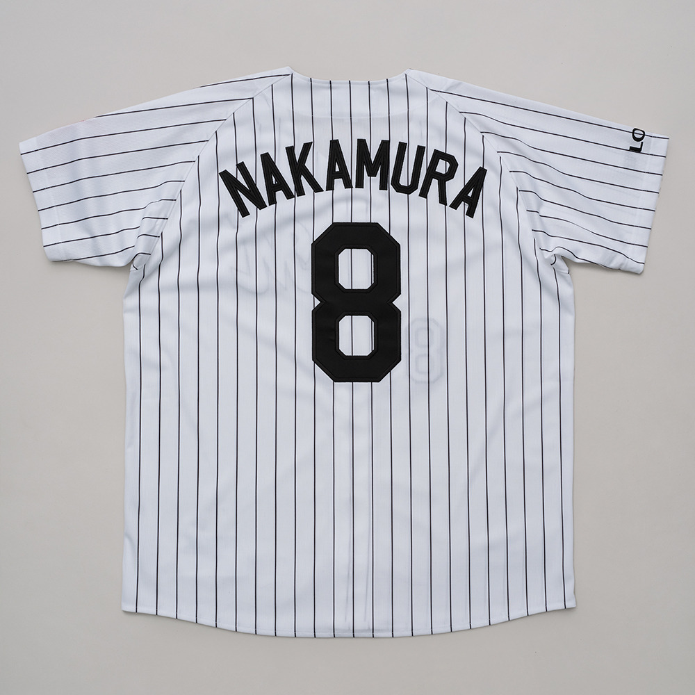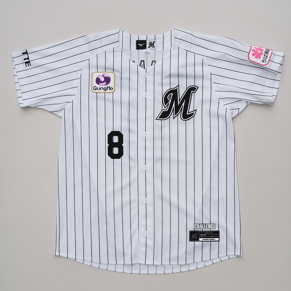 1995年から受け継ぐ伝統のピンストライプのHOMEユニホームにはCHALLENGE(挑戦)が、左裾にパッチとしてデザインされています。