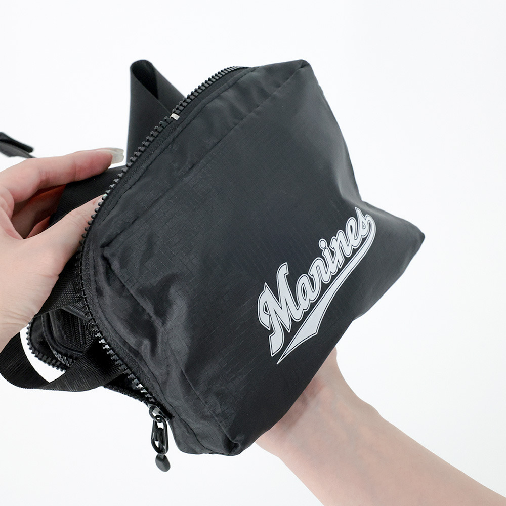 使わない時はフロントポケットに折りたたんで、約18cm×12.5cmのコンパクトサイズに。メインで使うバッグに忍ばせておけば、球場でグッズを買いすぎた時のサブバッグとして大活躍します。