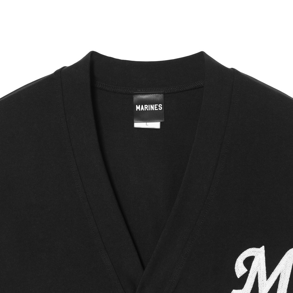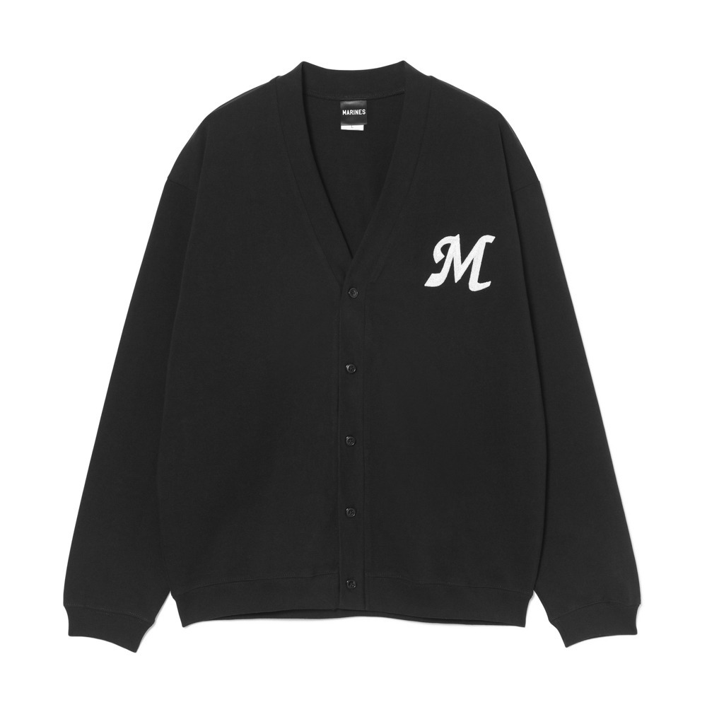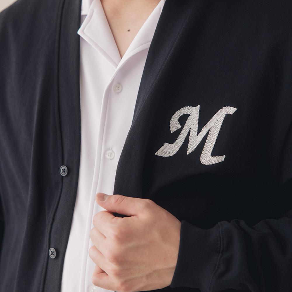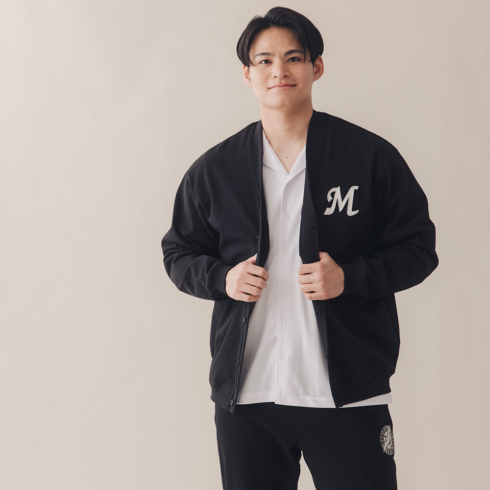 通常の刺繍よりも立体感のあるチェーンステッチ技法で胸元にマリーンズのイニシャル「M」を刺繍した、温もりを感じさせるデザインのカーディガン。