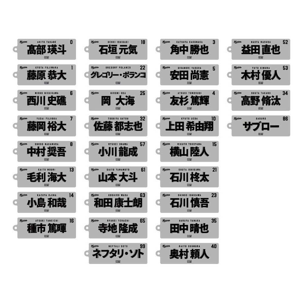 #0髙部、#1藤原、#3角中、#4友杉、#5安田、#6西川、#7藤岡、#8中村奨、#10上田、#13毛利、#14小島、#15横山、#16種市、#18石垣元、#21石川柊、#22ポランコ、#23石川慎、#25岡、#32佐藤、#34高野、#35田中晴、#40奥村、#52益田、#53木村、#57小川、#61山本大、#63和田、#65寺地、#86サブロー、#99ソト