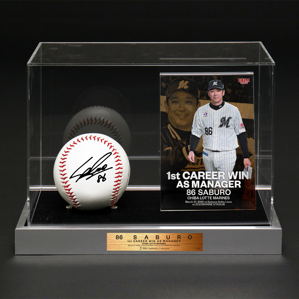 これを記念し、初勝利試合の成績を刻印したBBM Authentic Collection オリジナルボールに本人が直筆サインを書き入れた記念商品です。専用の観賞用ケースには写真をコラージュし、デザインされたオリジナルトレカがセットされます。