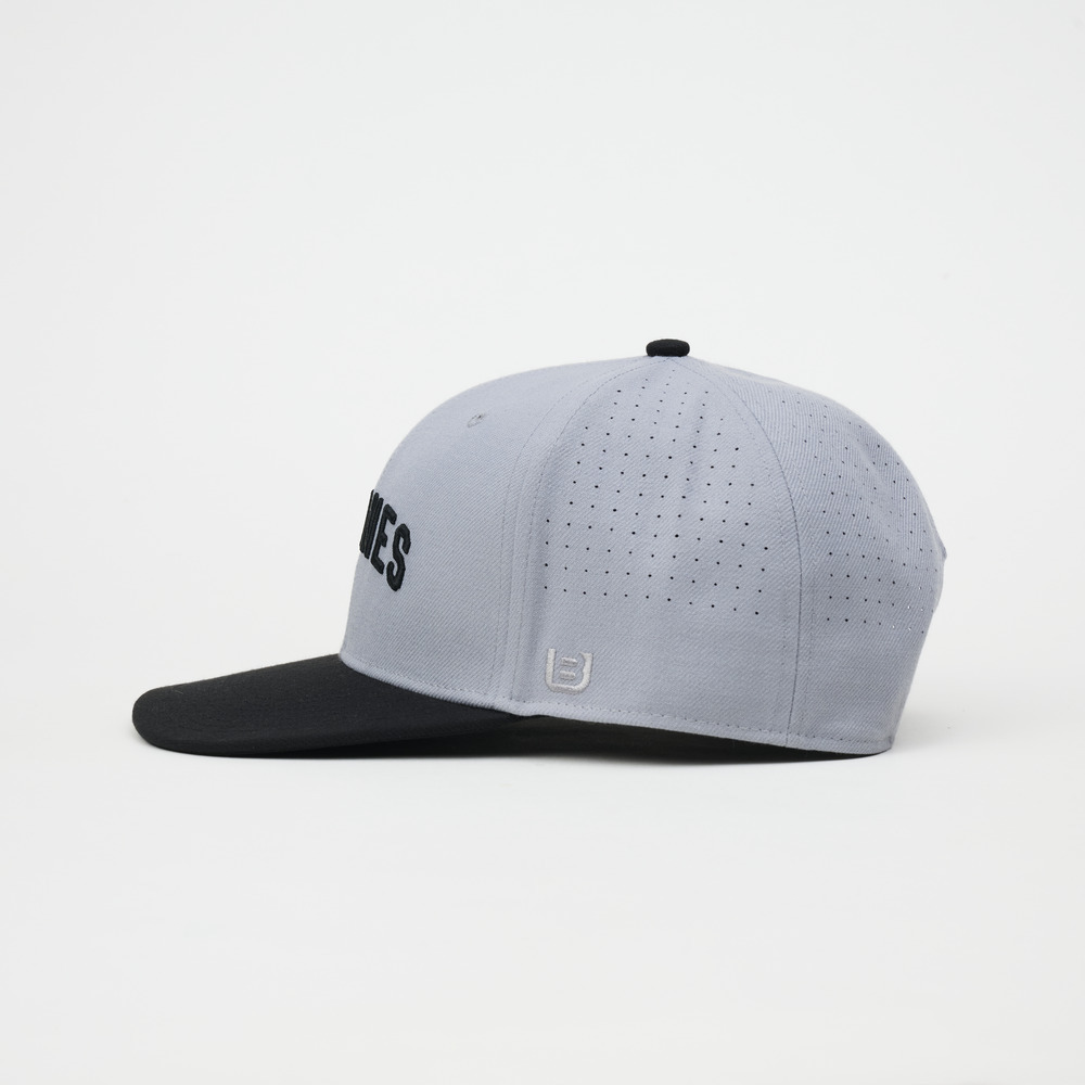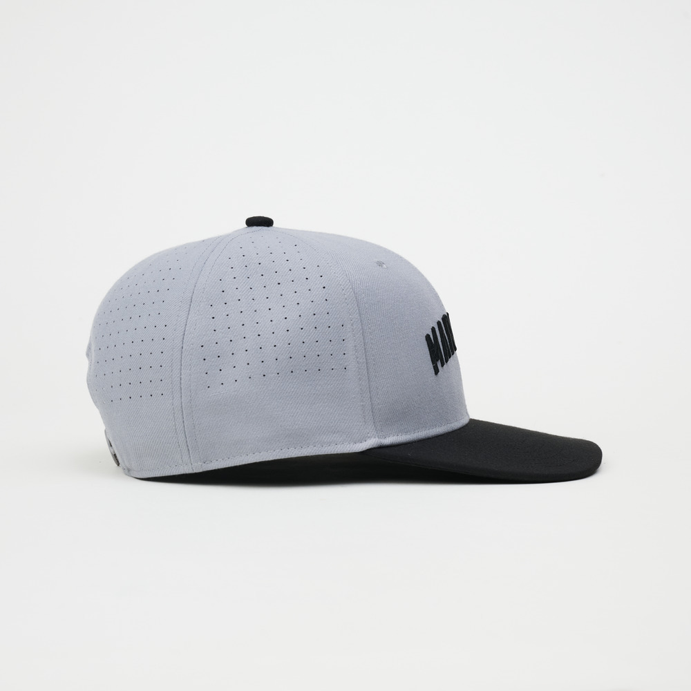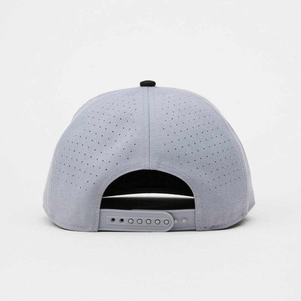 フラットバイザーを基調に立体的に構築されたフォルムのモデル。シャープな輪郭と安定感のあるクラウン設計に、背面にはレーザーカットによる通気構造を採用。