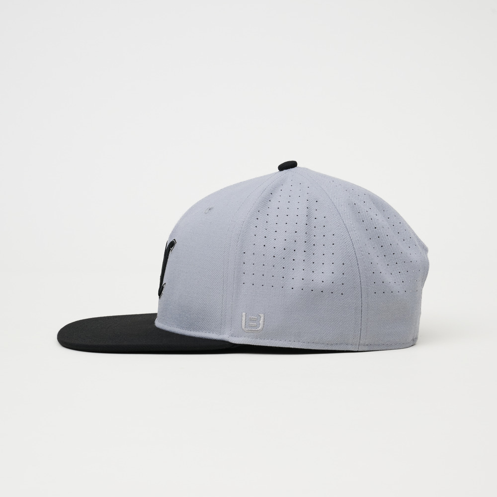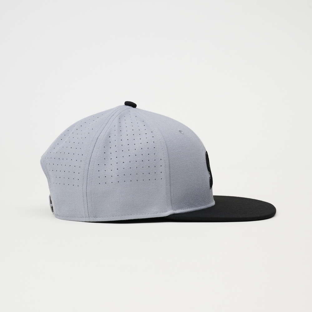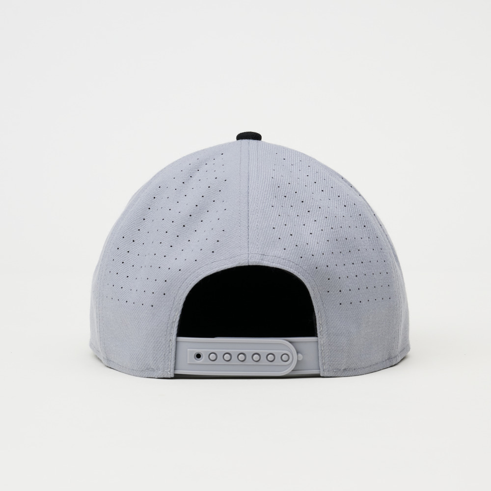 フラットバイザーを基調に立体的に構築されたフォルムのモデル。シャープな輪郭と安定感のあるクラウン設計に、背面にはレーザーカットによる通気構造を採用。